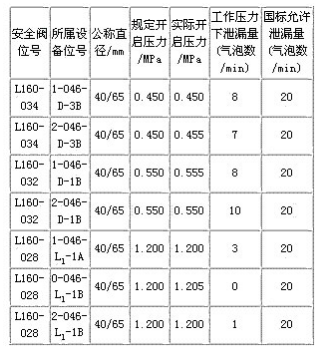 針對受熱變形泄漏問題,經(jīng)反復比較試驗,改進了原安全閥密封結構,將閥瓣與導向塊連成一體,將錐面密封改為平面密封,增加了閥瓣厚度,并在閥座和閥瓣的密封面上堆焊鈷基硬質合金,以提高密封面的耐溫性能和表面硬度,解決了受熱變形泄漏問題,改進后的閥瓣結構見圖1b。根據(jù)成套設備的安裝尺寸及性能參數(shù),首批試制了2個品種、3個規(guī)格共7臺平面密封安全閥,適用介質為聯(lián)苯加聯(lián)苯醚,工作溫度小于或等于330 ℃,開啟壓力分別為0.45MPa、0.55MPa和1.2MPa。安裝于某生產(chǎn)線上連續(xù)試用123天,停產(chǎn)檢修時拆下進行開啟壓力和密封性檢驗,結果見表1。表中數(shù)據(jù)說明,試用的這批安全閥,開啟壓力和密封性能均達到國家標準規(guī)定的優(yōu)質品要求。